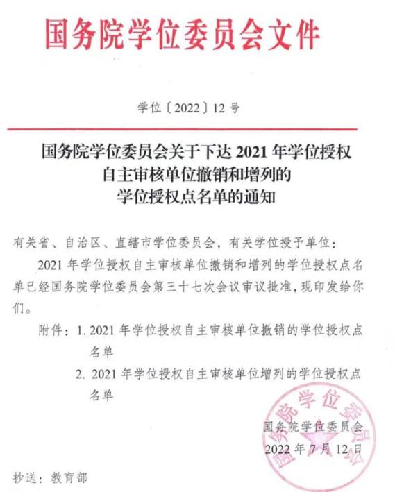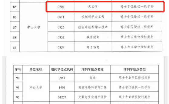 2022年7月12日,国务院学位委员会发布了《关于下达2021年学位授权自主审核单位撤销和增列的学位授权点名单的通知》(学位〔2022〕12号),其中中山大学获批增列天文学等五个一级学科博士学位授权点。