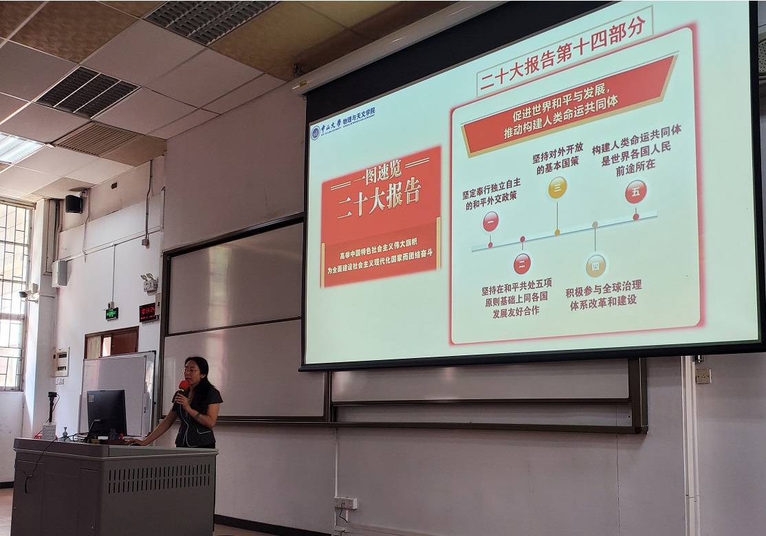 10月21日,学院党委书记郝雅娟同志在广州校区南校园,以“让青春绽放绚丽之花”为主题,为2022级本科生讲授“思政第一课”。郝雅娟书记带领同学们认真学习《习近平谈治国理政》第四卷和党的二十大报告,围绕厚植家国情怀、坚定“四个自信”、练就过硬本领三个主题,结合中大优秀校友的事迹,鼓励同学们传承中大的红色血脉,秉承“学在中大、追求卓越”的优良学风,练就强健体魄、学好专业知识、努力全面发展,立志做有理想、敢担当、能吃苦、肯奋斗的新时代好青年,让青春在全面建设社会主义现代化国家的火热实践中绽放绚丽之花。