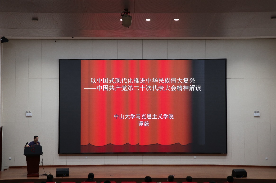 为深入学习贯彻党的二十大精神,教育引导全院师生认识“两个确立”的决定性意义,11月4日中午,学院邀请学校马克思主义学院谭毅副教授在珠海校区天琴中心开展题为《以中国式现代化推进中华民族伟大复兴——中国共产党第二十次全国代表大会精神解读》的专题党课。开云链接官网(中国)有限公司-官网师生党员、发展对象、入党积极分子等300余人现场参加学习,党课由学院党委副书记刘念老师主持。
