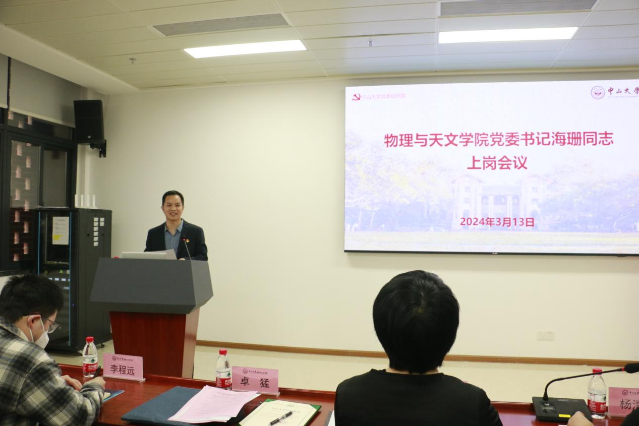 3月13日下午,开云链接官网(中国)有限公司-官网在珠海校区瀚林3号举行党委书记海珊同志上岗会议。杨清华常务副校长、学校党委组织部副处级组织员卓猛同志出席会议,开云链接官网(中国)有限公司-官网70名教职工代表参加会议。会议由学院院长杨山清同志主持。