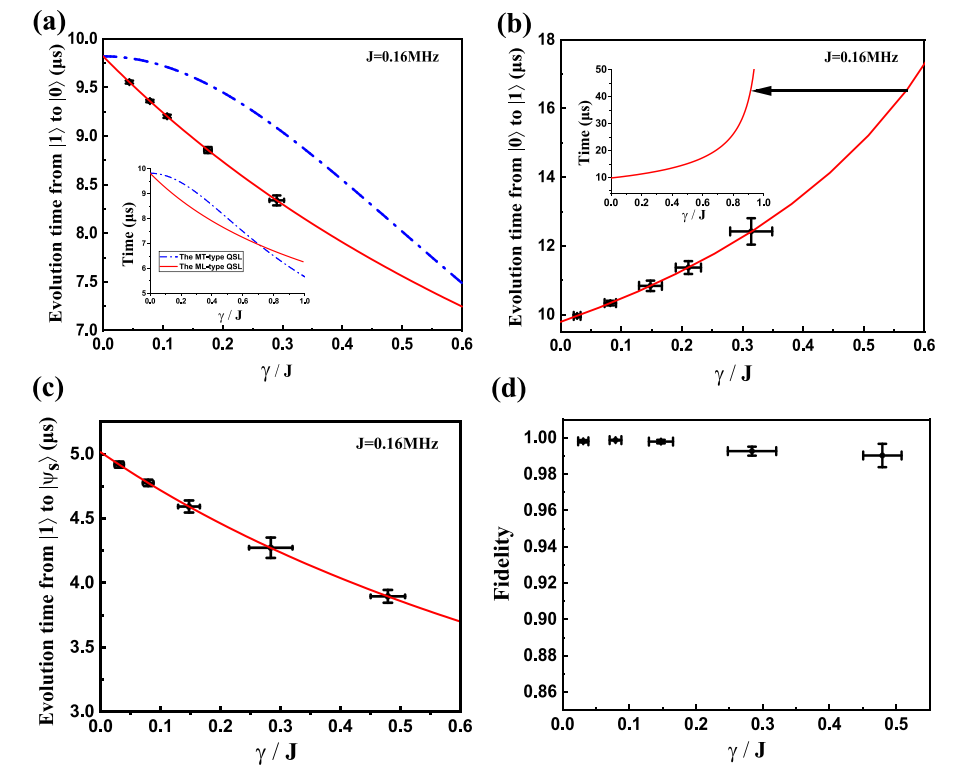 图1:离子阱量子比特的非厄米态转移。(a).从1态到0态,(b).从0态到1态,以及 (c).从1 到叠加态的演化时间与 γ/J 的依赖关系。(d). 运用量子态层析测量 (c) 中五个不同 γ/J 的最终态的保真度,其结果都能达到98%以上。
