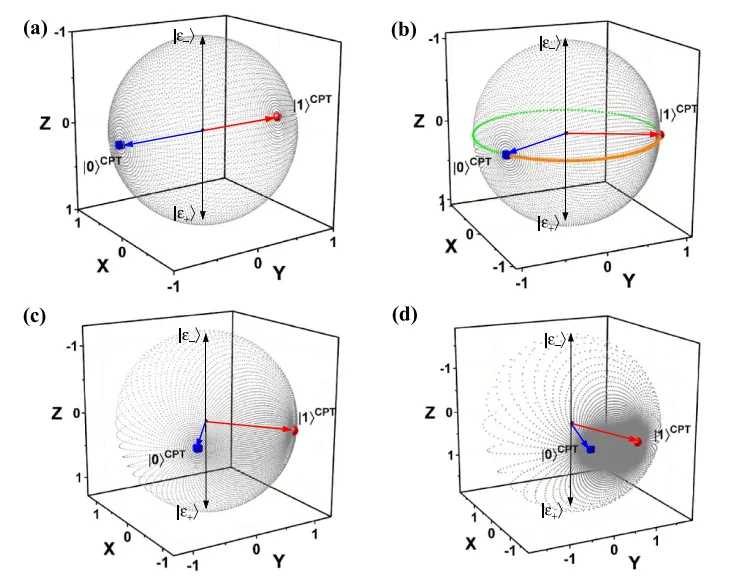图2:厄米布洛赫球到宇称时间对称非厄米布洛赫球的映射。红色和蓝色小球分别表示1态 和0态从厄米布洛赫球到宇称时间对称非厄米布洛赫球1CPT和0CPT态的映射。耗散强度的取值分别为(a) 0J,(b) 0.48J,(c) 0.8J,(d) 0.96J。在(b)中,两条橙色和绿色的路径分别表示在非厄米情形下,从1态到0态和从0态到1态的演化路径。