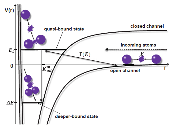 图1:s-波窄费什巴赫共振附近三体复合示意图。为准束缚分子态。通过三体复合反应,准束缚态分子可向深束缚态跃迁从而释放巨大能量,使其逃离势阱。