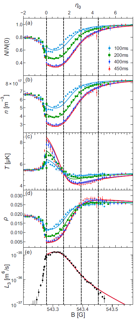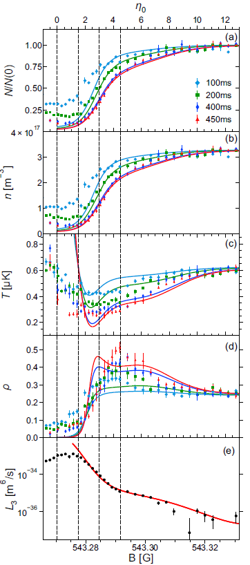 图2:初始温度为5.1uK(左图)和0.6uK(右图)气体的原子数(a),原子数密度(b),温度(c),相空间密度(d)以及三体复合率(e)在s波窄费什巴赫共振附近的实验结果。在附近温度的冷却效率最高。