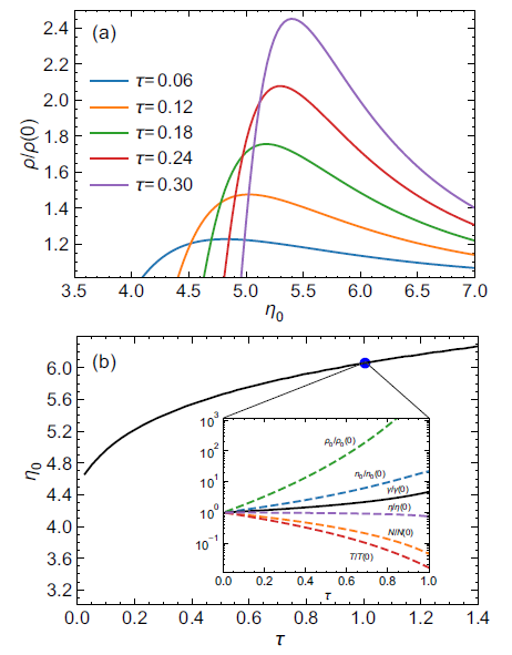 图2分别展示了两个具有不同初始温度气体的碰撞冷却结果。通过调节磁场强度,可以改变三体复合的速率和阈值能量。当阈值能量低于3/2时,原子反而会被加热;而当阈值能量高于3/2时,原子温度会逐渐被降低;而当阈值能量进一步增加超过3时,气体的相空间密度也会被增加。此外,通过不同温度的冷却曲线比较发现温度越低冷却效率越高。这对于实现高简并度的费米气体来说意义重大。