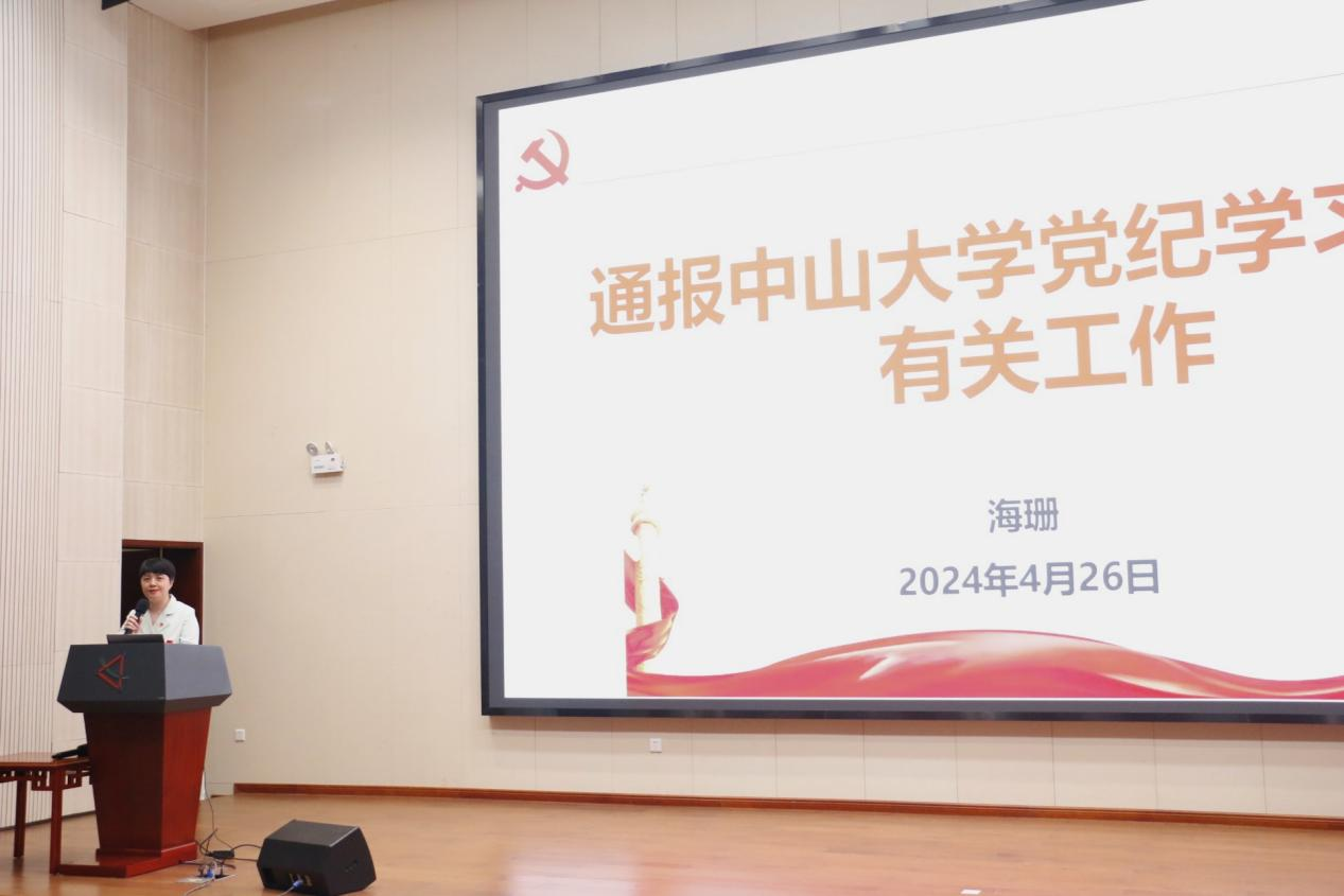 海珊书记通报了中山大学党纪学习教育有关工作并开展党纪学习警示教育。海珊书记结合学校党委动员部署党纪学习教育有关工作,进一步强调开展党纪学习教育是全党的一项重要政治任务,全体师生党员要高度重视党纪学习教育,切实增强政治自觉,切实把学习成果体现为推动学院事业发展的实际成效,营造学纪、知纪、明纪、守纪的浓厚氛围,有效推动学院高质量内涵式发展。海珊书记结合全国高校违纪违法典型案例开展警示教育,要求全体教职工要增强遵规守纪自觉。随后结合日常涉密信息管理和对外交流合作两方面的典型案例开展保密警示教育,特别强调在对外交流合作中应当严守国家秘密,严格遵守保密管理规定。