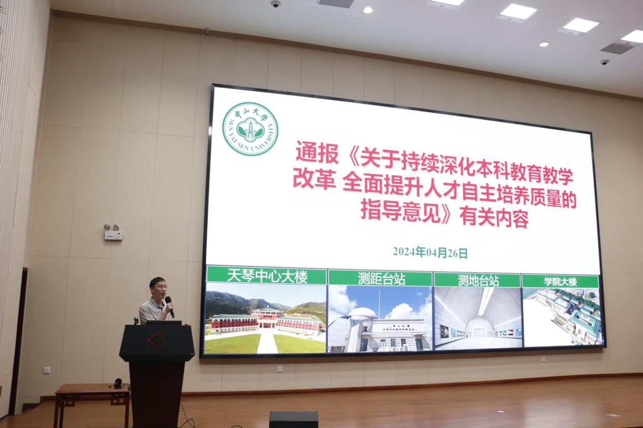 马波副院长通报了《中山大学关于持续深化本科教育教学改革全面提升人才自主培养质量的指导意见》(下称:《指导意见》)有关内容并部署有关工作。马波副院长简要介绍了《指导意见》的总体目标,着重提到了三个“最大限度”和两个“转变”,强调集中大类培养与专业培养相结合,通识教育与专业教育相结合,并在推动以学生为中心的教学模式改革,探索教学体制机制改革方面进行有关工作部署。