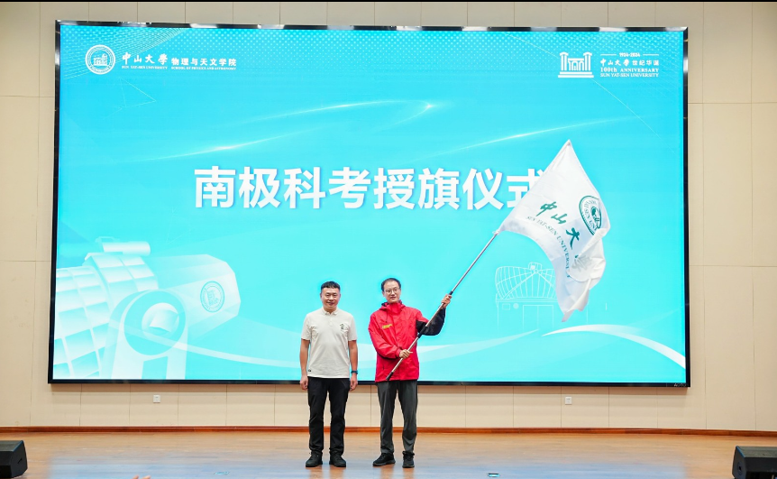 会上,中山大学科学研究院院长程晓教授代表中山大学向中国第41次南极科考中山大学队员代表马斌副教授授旗。中国南极科考是服务国家南极战略的重要任务,学院将国家需求与科学前沿相结合,大力推进南极红外望远镜计划,首台南极双筒红外望远镜与国家天文台合作安装、运行在南极冰盖最高点的昆仑站。在本次科考中,马斌副教授将继续维护该望远镜,并执行与国家天文台、中国极地研究中心的其他合作任务。